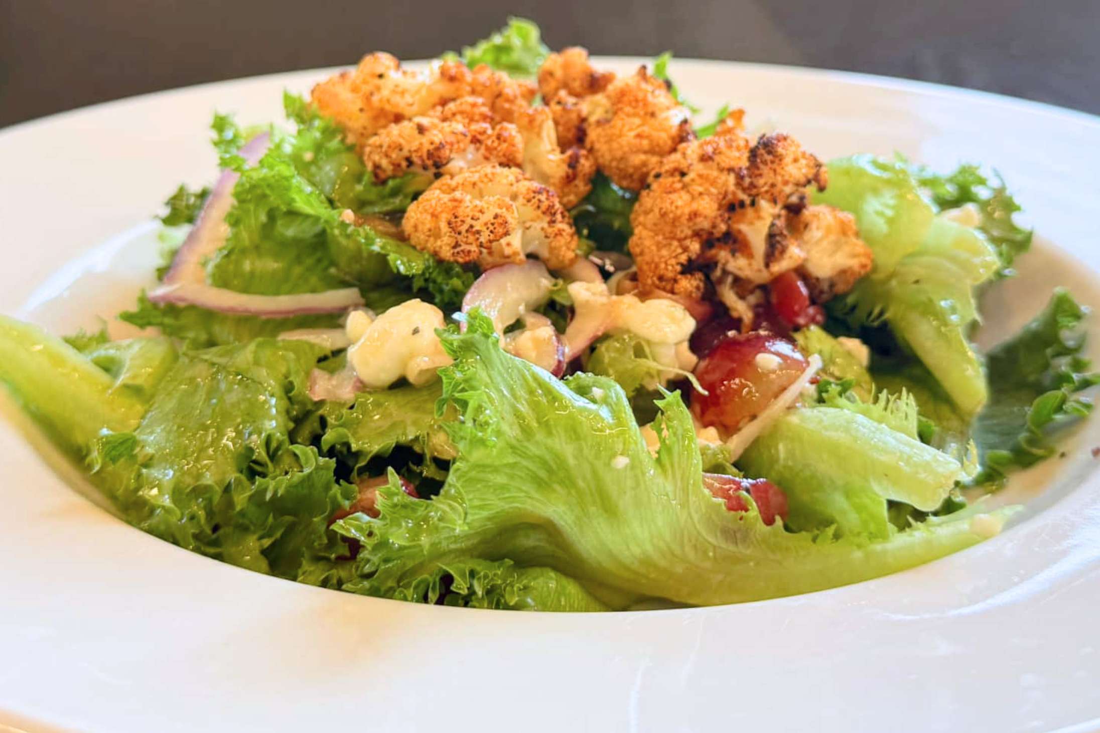 Roasted cauliflower over crisp greens with goat cheese, pickled grapes, and red onion. Tossed in a honey dijon vinaigrette