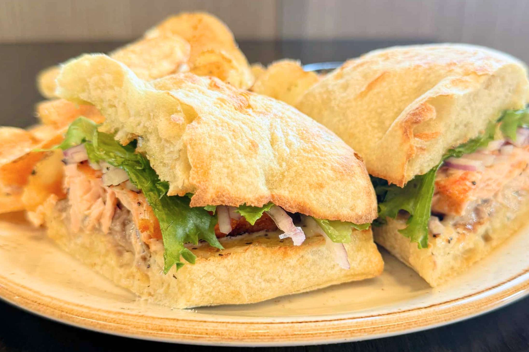Seared salmon layered on toasted bread with crisp lettuce, red onion, and white BBQ sauce. Finished with lemon