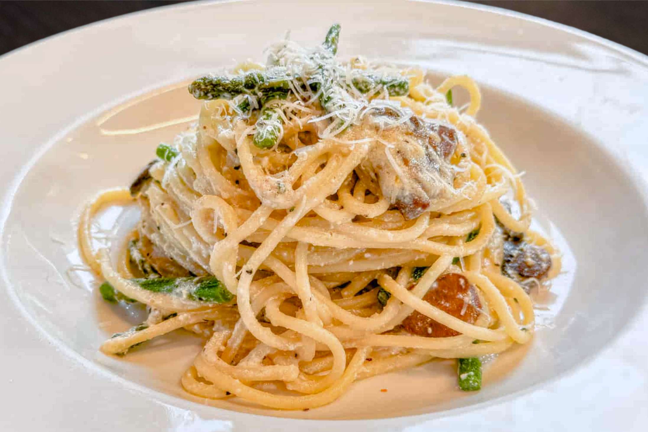 Spaghetti tossed in a creamy lemon ricotta sauce with asparagus and sautéed mushrooms. Ffinished with Parmigiano Reggiano.